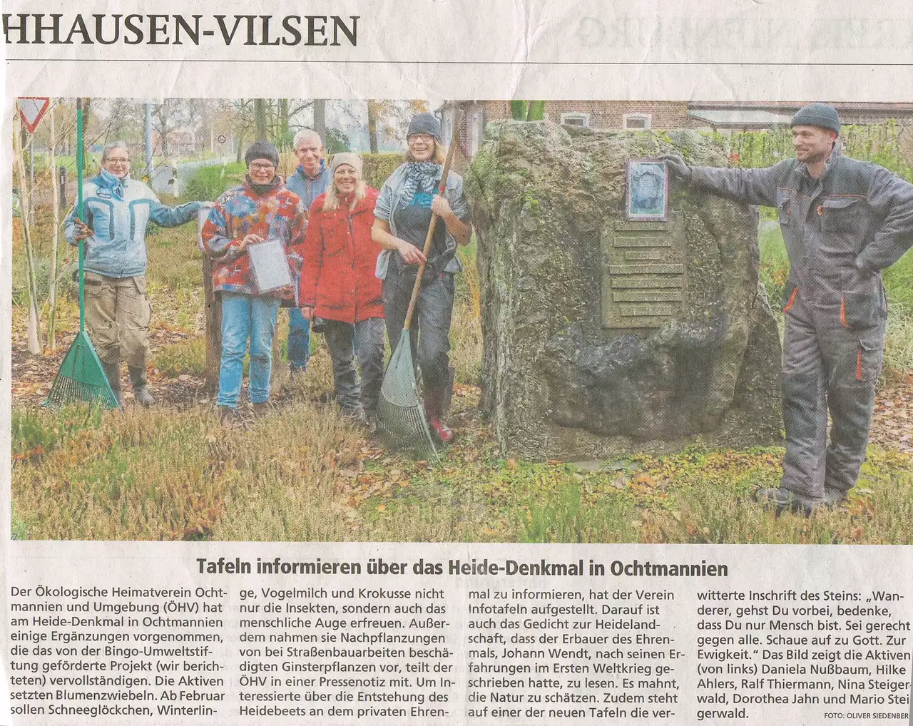 Im Herbst 2019 haben wir Informationstafeln installiert, denen Interessierte die Geschichte des Heide - Denkmals erzählen. Auch das Gedicht des Erbauers ist darauf nachzulesen (s. Bild). Bei der Gelegenheit haben wir die Pflanzung mit dem Setzen von Blumenzwiebeln vervollständigt. Fortan erfreuen Krokusse, Winterlinge und Vogelmilch das menschliche Auge und die Insekten im frühen Frühjahr.