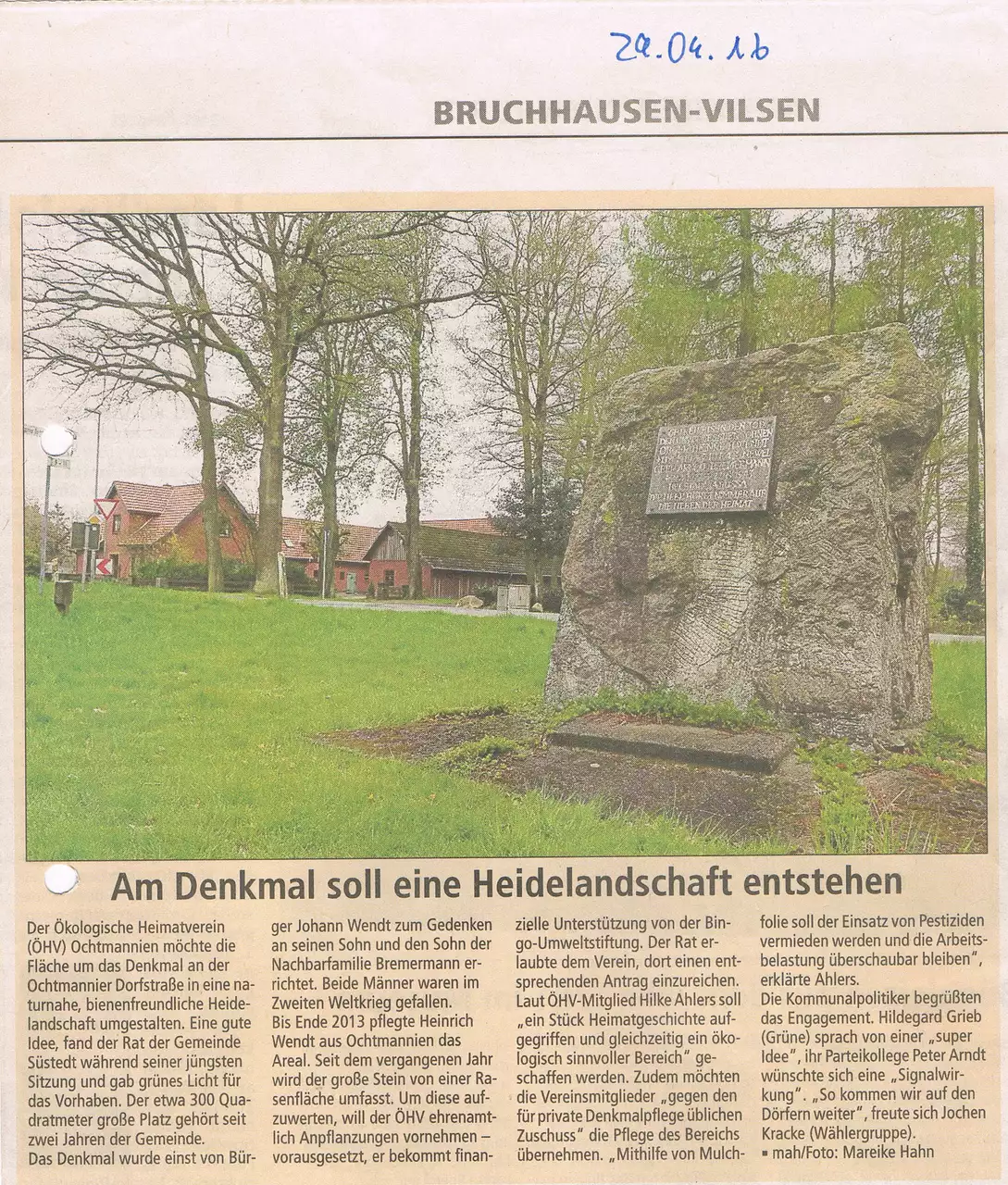 Aber der Reihe nach .. bei dem Denkmal an der Ochtmannier Dorfstraße Ecke Alter Heerweg/Otersen handelt es sich um ein privates Ehrenmal, das zwei benachbarte Familien (Wendt und Bremermann) dort nach dem zweiten Weltkrieg für ihre gefallenen Söhne errichtet hatten. Gepflegt wurde das Grundstück viele Jahrzehnte vom Erben der Familie Bremermann. Dieser hatte die Pflege des Grundstücks aus Altersgründen abgegeben. Die Gemeinde hatte dann aus dem Bereich um das Ehrenmal herum ein Stück Rasen gemacht, um die Pflege einfacher zu gestalten.